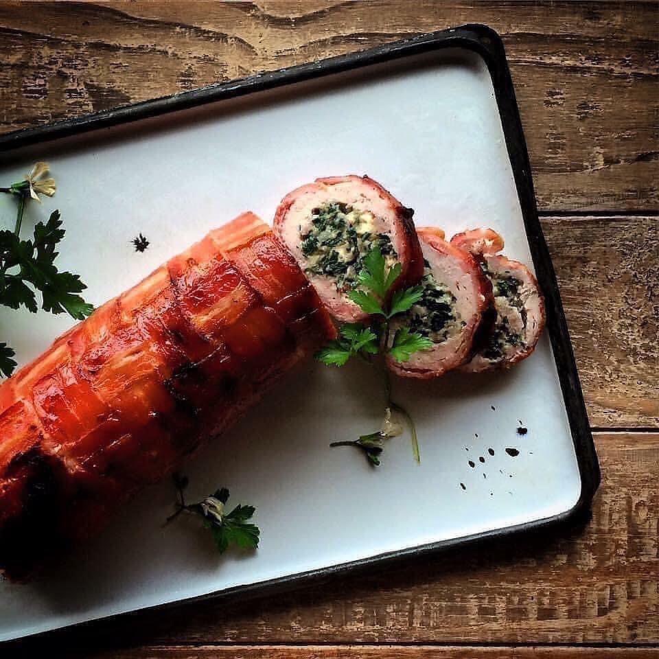 A hearty blend of spinach and feta stuffed inside succulent chicken, finished with a savoury bacon wrap.